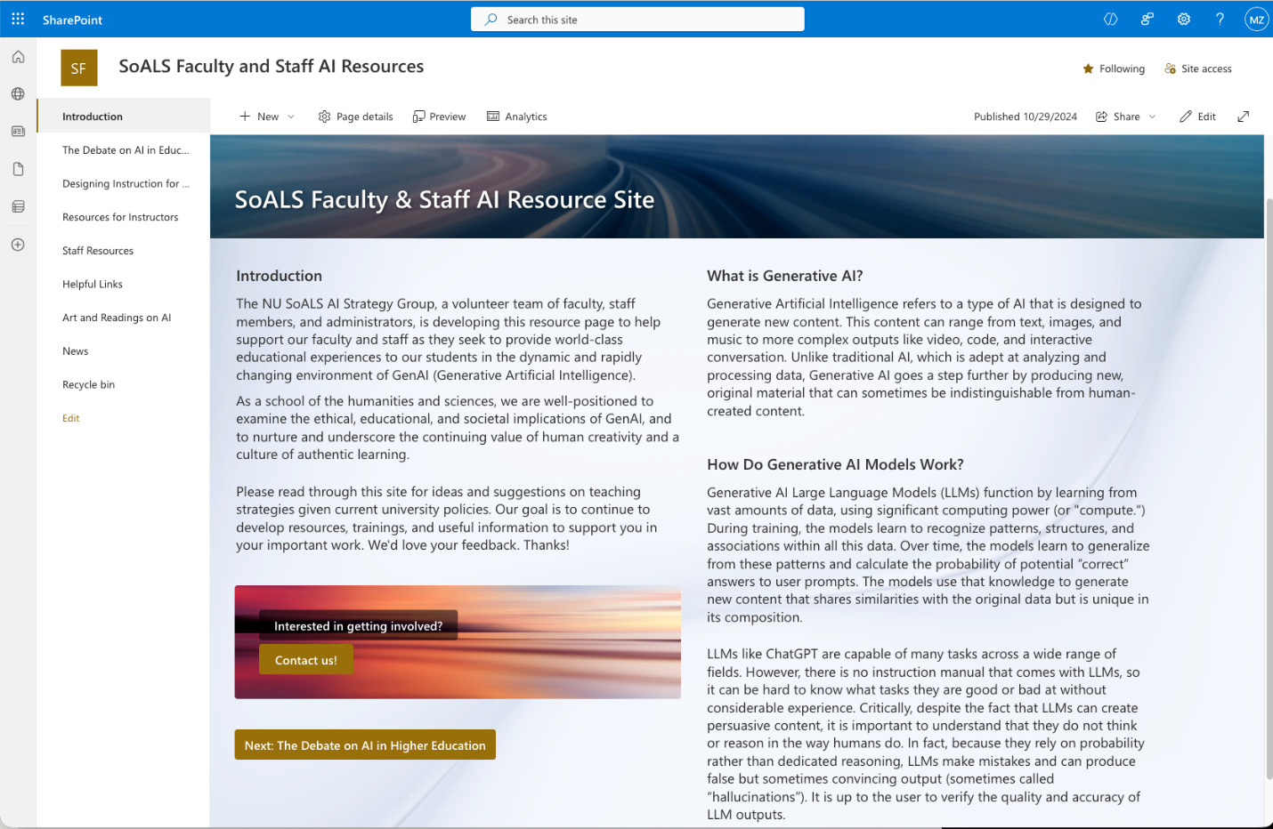This recognition led to a change in direction that leveraged the knowledge and ideas of the SoALS AI Strategy Group, a volunteer team of faculty, staff members, and administrators who collaboratively developed what would become the AI Resources site. Rather than a top-down initiative driven by administration or a technical team, the group brought together people with diverse disciplinary backgrounds, institutional roles, and perspectives on AI. Some members approached AI with enthusiasm for its pedagogical possibilities; others harbored significant concerns about academic integrity, labor displacement, or the homogenization of student writing. Instead of suppressing these tensions, the group’s discussions modeled the kind of multivocal engagement the site would eventually encourage. The resulting resource reflected this diversity of perspective, presenting AI neither as an unambiguous good to be embraced nor as a threat to be resisted, but as a complex phenomenon requiring ongoing critical engagement. The site was conceived from the outset as a living document designed to evolve with the fast-moving technological landscape, regularly updated to reflect new developments, shifting policies, and emerging resources.