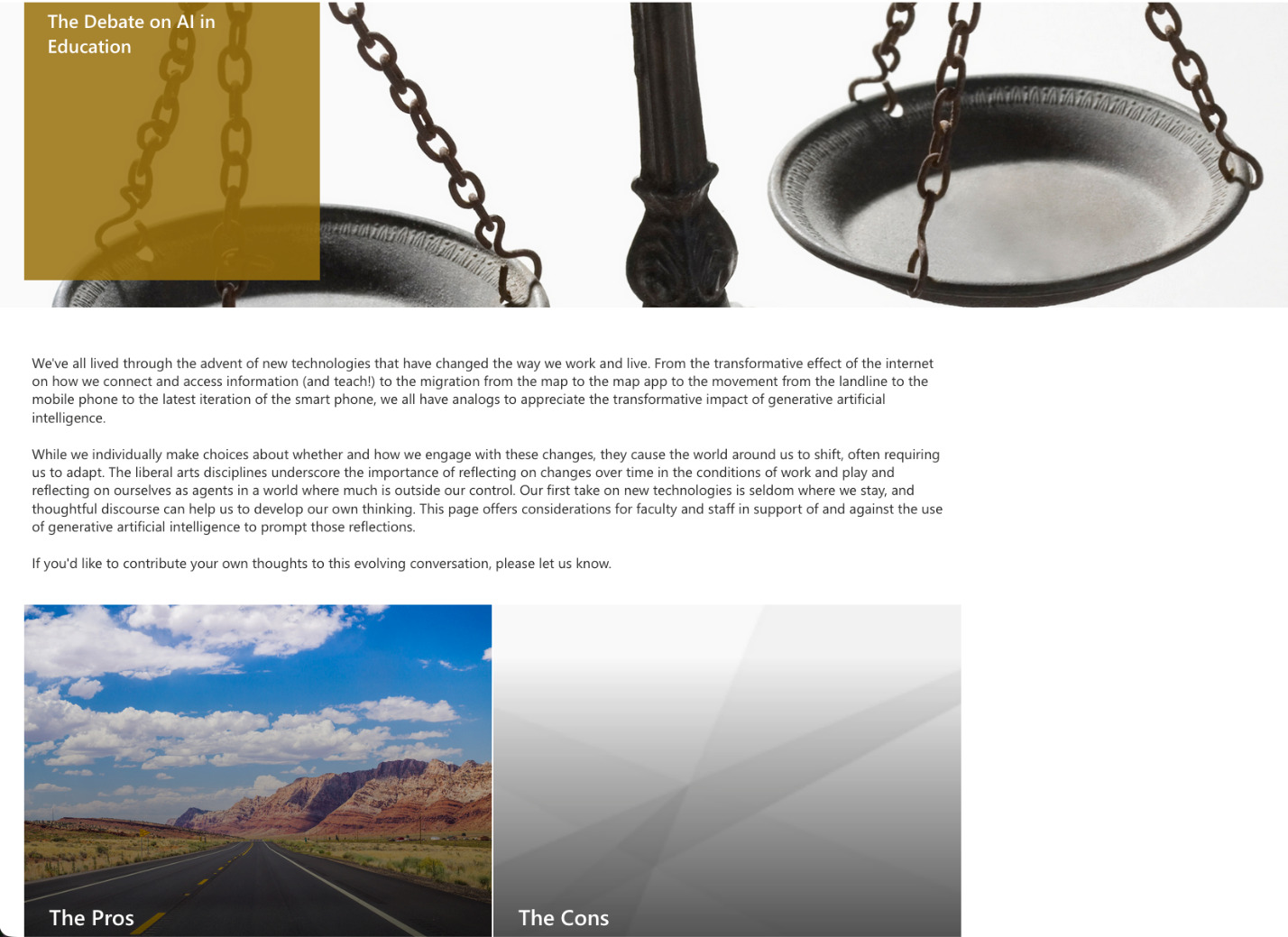 The site’s architecture reflects several deliberate design choices that distinguish it from generic AI resource collections. The Introduction page establishes the school’s distinctive positioning as a school of the humanities and sciences, “to examine the ethical, educational, and societal implications of GenAI, and to nurture and underscore the continuing value of human creativity and a culture of authentic learning” (SoALS AI Resources site). This framing situates AI engagement within the school’s existing mission and values rather than treating it as an external technical matter to be managed. The page also includes an invitation for community involvement, signaling that the site represents an ongoing conversation rather than a finished product handed down from above. Subsequent pages provide practical resources for instructors and staff, curated external links to high-quality scholarship and tools, current news developments, and policy guidance, including honest assessments of AI detection tool limitations. However, two sections particularly embody the site’s distinctive approach: the Debate on AI in Education page and the Art and Readings on AI page, each of which merits closer examination for what it reveals about liberal arts engagement with technology.