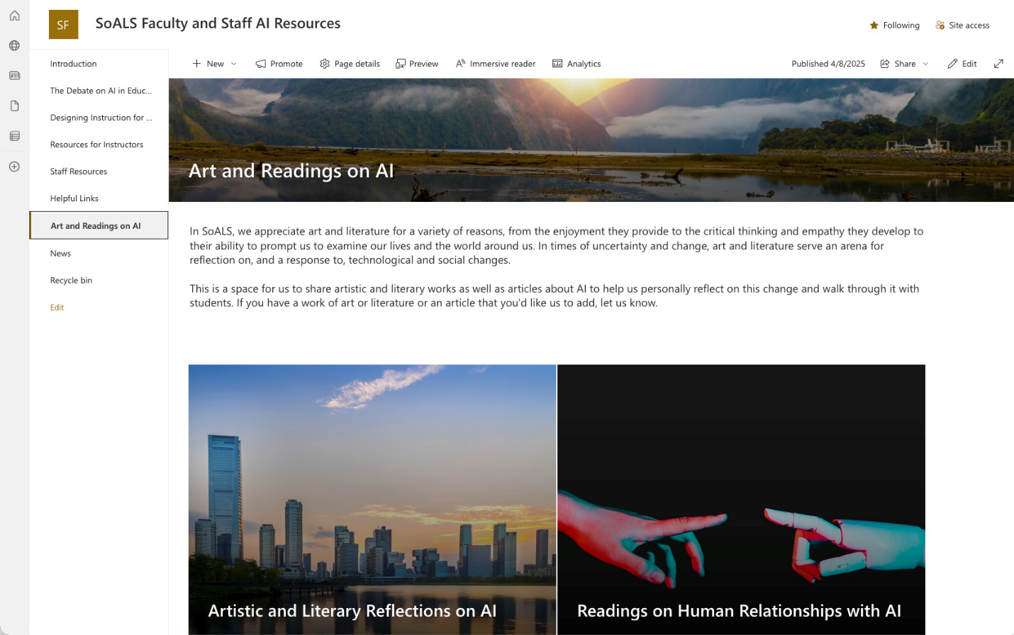 Another distinctive element of the SoALS site is the Art and Readings on AI page, which brings a humanities lens to AI engagement that is notably absent from many technology resource collections. The page’s rationale reflects liberal arts values explicitly: “In SoALS, we appreciate art and literature for a variety of reasons, from the enjoyment they provide to the critical thinking and empathy they develop to their ability to prompt us to examine our lives and the world around us. In times of uncertainty and change, art and literature serve as an arena for reflection on, and a response to, technological and social changes.” Artistic and literary engagement in this case exist not as peripheral enrichment but as a legitimate methodology for understanding technological transformation. The page is organized into two categories—Artistic and Literary Reflections on AI and Readings on Human Relationships with AI—suggesting that understanding AI requires not only technical knowledge but also the interpretive and reflective capacities that humanities disciplines cultivate. By including this section, the site implicitly argues that the question of how to respond to AI is not merely a technical or policy matter but a humanistic one, requiring the kind of meaning-making that has always been central to liberal arts inquiry.